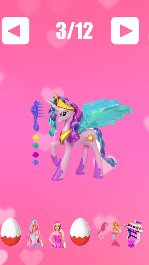 In this princess girl games you find lots of beautiful girl toys: Mermaid, Barbie figure, Little Pony, Princess. This new game is different from other girls games because here are princess and surprise eggs together just tap on surprise egg and find your favorite girl doll or toy.