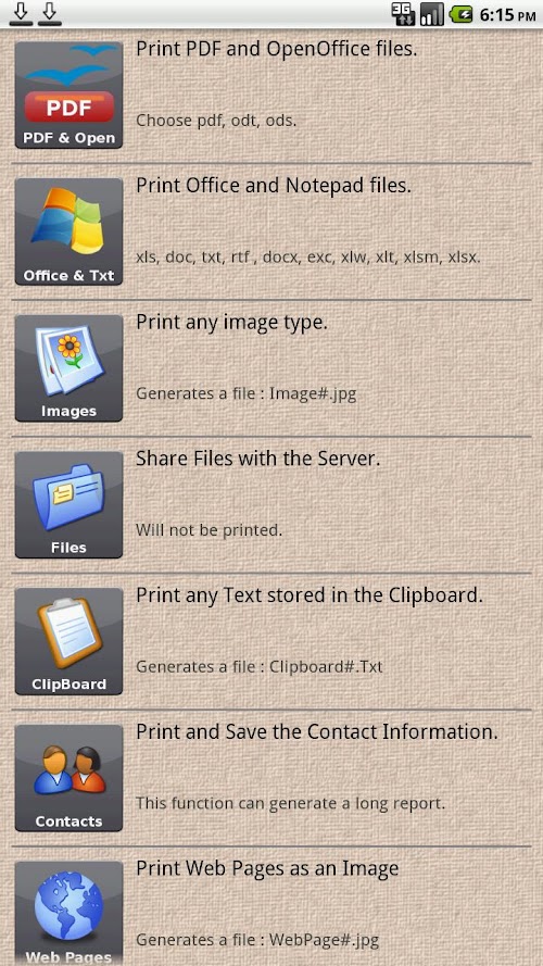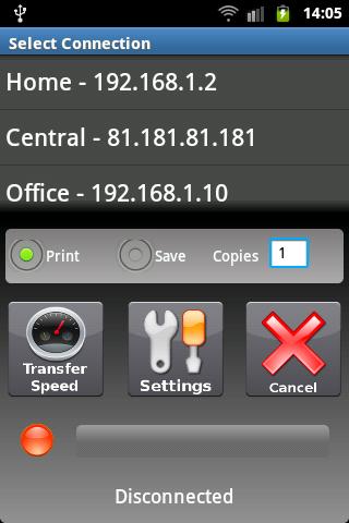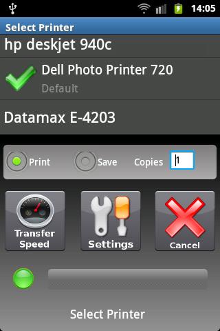 Print PDF documents, Office, OpenOffice, txt and all kind of images, from your Android device directly to any printer connected to your PC. (Including network and WiFi printers).