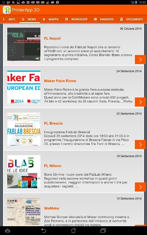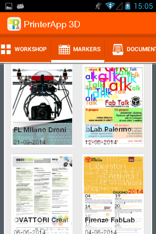 - Notifiche delle attività svolte nella propria città con info e link su workshop e corsi, su grafica 3D, stampa 3D, elettronica, Arduino e Linux.