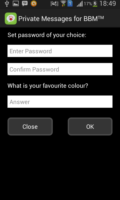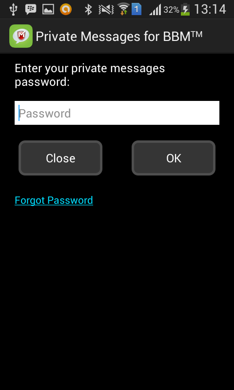 The private messages self-destruct from device for additional privacy so that no one can access this message without your Private Messages for BBM password. You can only view this secured message from this App by logging in with your password. It protects your BBM communications from intrusions and unauthorized access.
