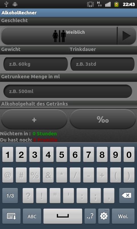 Eine sehr simple App, um den Blutalkoholgehalt in Promille auszurechnen.