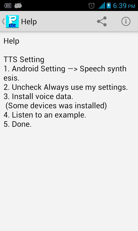 * If SpeechSynthesis Data in your android device is not installed yet, this software will detect it and ask your permission to download SpeechSynthesis Data Installer at Android Market. The TTS only work if the SpeechSynthesis Data was installed.