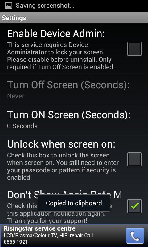 ** Due to the sensitivity of the Proximity Sensor, I strongly suggest not to use the function turn off screen by this application. To turn off the feature, just set the duration to -1 seconds.