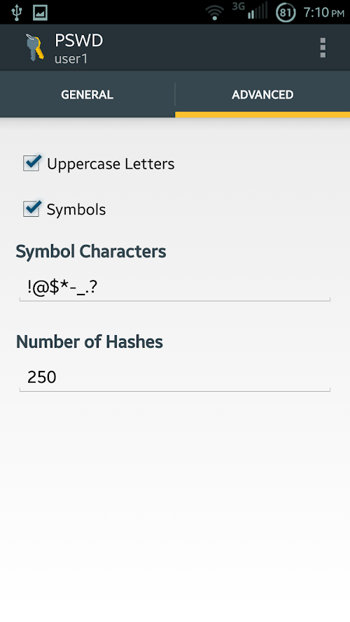 At a minimum: a username, master password and site domain are required to generate a site-specific password (this generates a different password for each website or service). Optional parameters include final password length, the inclusion of uppercase letters, the inclusion of symbols, the symbol characters to choose from, and the number of SHA-256 hashes used to create the final password.