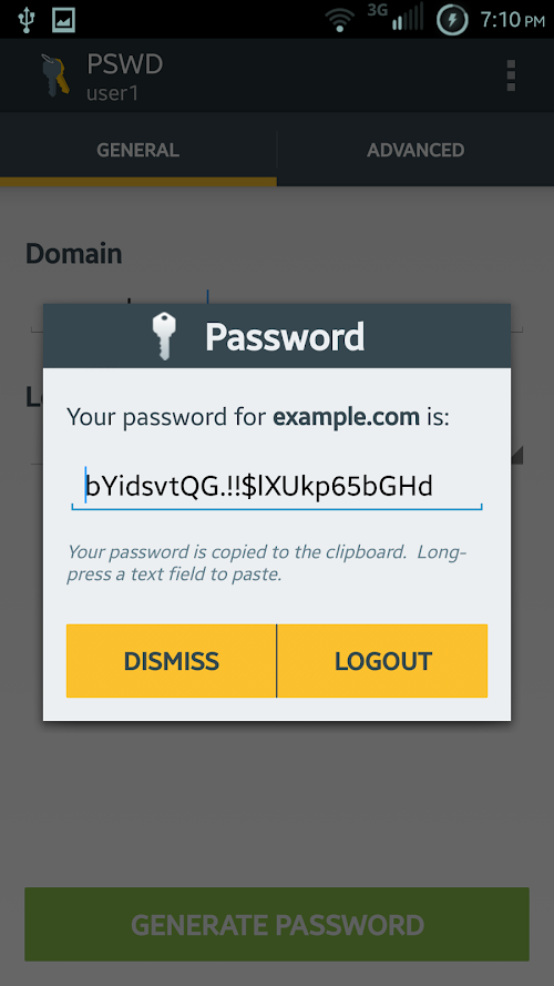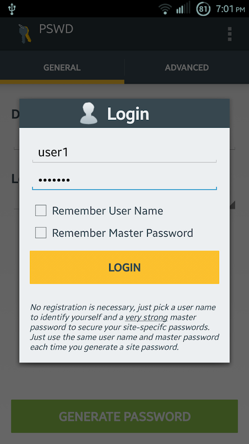PSWD is a pseudo-random password generator that creates seemingly random site-specific passwords composed of uppercase and lowercase letters, numbers and (optionally) symbols. However, when given the same set of input information, the same final password is generated. This means your passwords don't need to be stored anywhere - when needed again they can simply be regenerated.