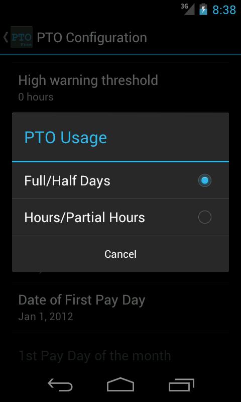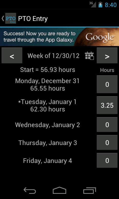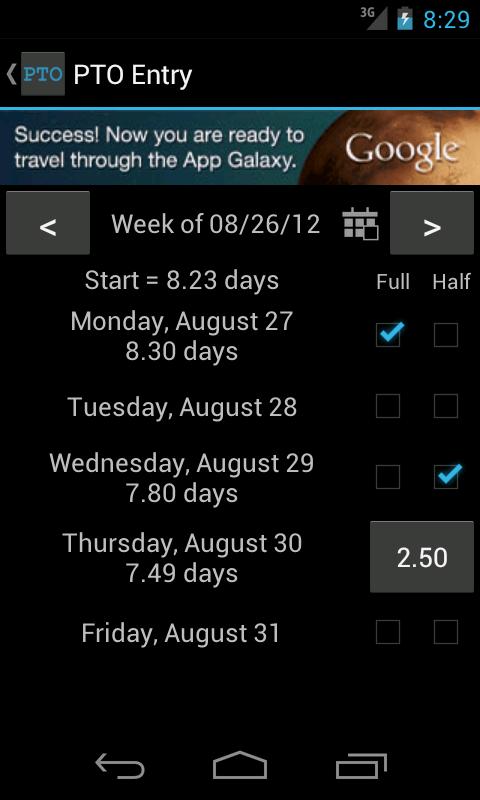 - If you want to take hour increments rarely, just long-press on the date in full/half day mode to enter hours or fractional hours. Long-press will also give you other options, like bonus entry.