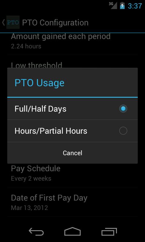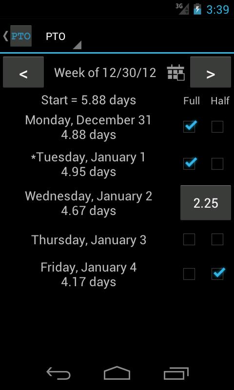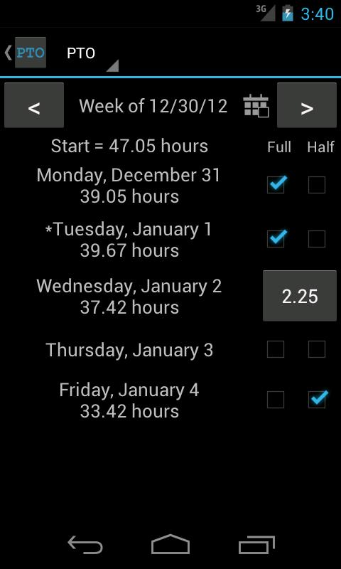 - If you want to take hour increments rarely, just long-press on the date in full/half day mode to enter hours or fractional hours. Long-press will also give you other options, like bonus entry.