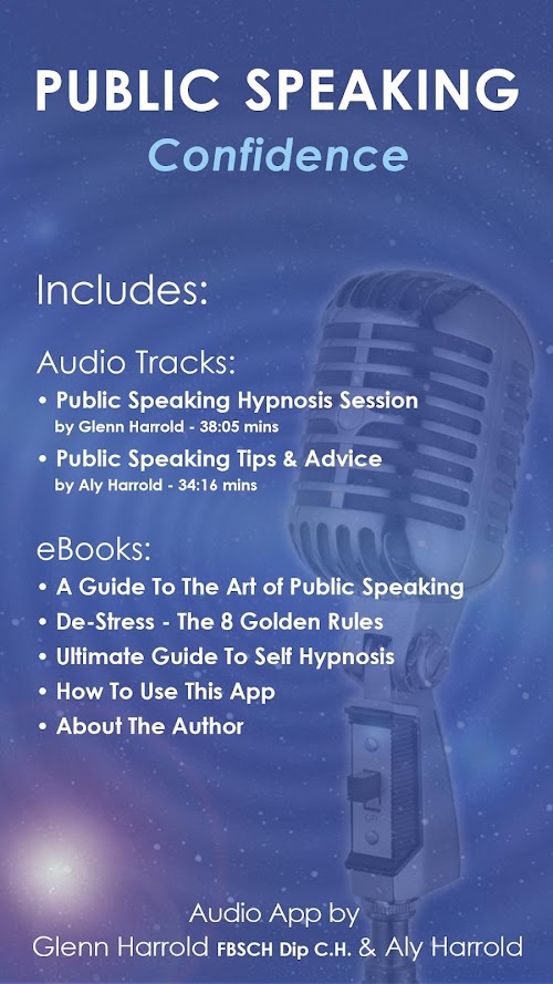 Public Speaking Confidence is a superb high quality hypnotherapy recording by best-selling self-help author Glenn Harrold. This comprehensive App includes a public speaking hypnosis session and a bonus “Tips & Advice” track by Aly Harrold. It also includes “A Guide to The Art of Public Speaking” eBook by Aly Harrold.