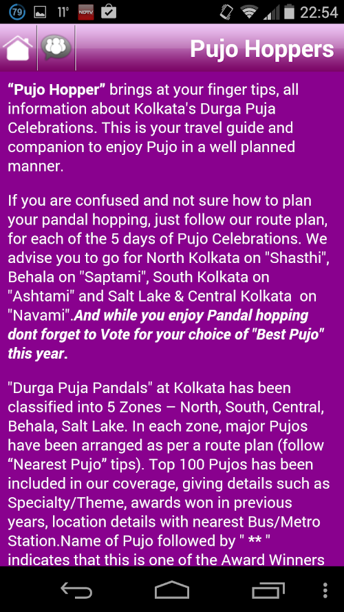 "Pujo Hoppers" is an app which adds flavor to your Durga Puja celebrations - the biggest festival of West Bengal.Millions of people from all across West Bengal hops around numerous Durga Puja Pandals of Kolkata, often bewildered and not sure how they can visit all the very best of Puja Pandals at Kolkata within a span of five days.To make your Durga Puja experience is enjoyable and secure, We Build Technology presents this unique Mobile App.This Durga Puja, download Pujo Hoppers and leave the planning part to it. Follow the suggested route map, itinerary and be informed about what to expect at various Puja Pandals this year.Explore our apps to see some of its interesting features which will make this Durga Puja a smart celebration!!