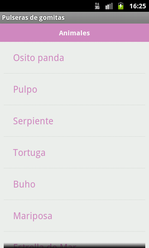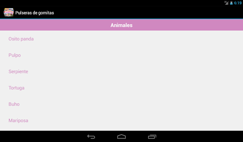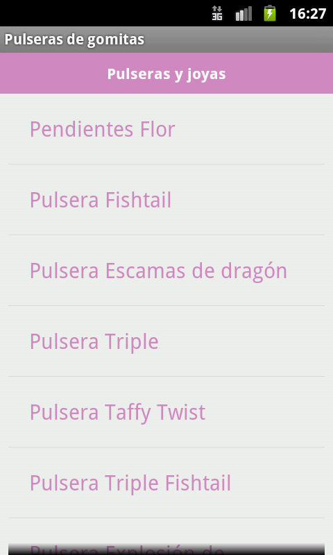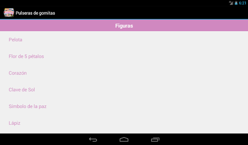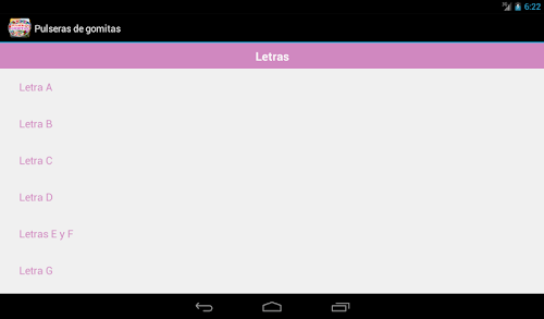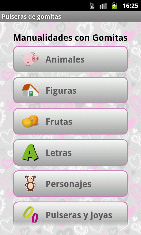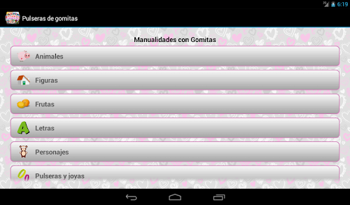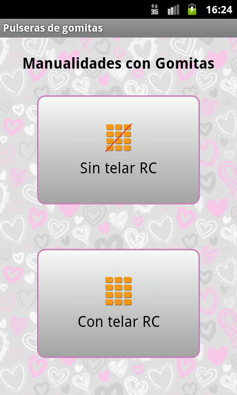 Desgranando un poco más el funcionamiento de la aplicación de pulseras de gomitas. En primer lugar te encontrarás con dos opciones, la primera de ellas es para acceder a las manualidades con gomitas sin la necesidad de utilizar telar; y en la segunda opción podrás ver todas las creaciones disponibles para hacer con telar (mayormente con el telar rainbow loom).