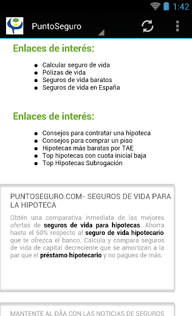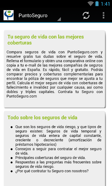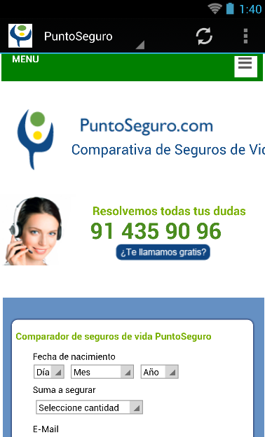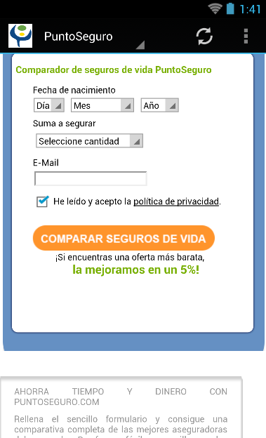 PuntoSeguro.com™ es el comparador de seguros de vida que te facilita una comparativa de seguros de vida de 15 aseguradoras de vida al mejor precio. Contratar el mejor seguro puede resultar una tarea complicada, pero afortunadamente en PuntoSeguro te lo ponemos muy fácil para encontrar el seguro que mejor se adapte a tus necesidades. Los seguros vida son seguros pensados para proteger a los seres queridos en caso de nuestro fallecimiento o invalidez. Son una solución perfecta para preservar la estabilidad economica en el futuro sin sacrificar el presente. Los seguros de PuntoSeguro.com son productos sencillos y flexibles que permiten asegurar tu vida por mucho menos de lo que piensas. Para conseguir tu comparativa sólo tienes que rellenar el formulario e inmediatamente podrás comparar precios y coberturas de las mejores aseguradoras en España. Somos independientes: Somos la primera correduría de seguros vida online que hubo a nivel nacional. No mantenemos vinculo accionarial con ninguna aseguradora lo que nos permite recomendarte siempre la mejor opción para tu perfil. PuntoSeguro.com se financia mediante la intermediación de pólizas de seguros. La transparencia es nuestra mejor virtud: Al ser los seguros vida anuales renovables, los precios que mostramos en el comparador son precios anuales, ya que si decides contratar tu seguro a través de PuntoSeguro, te aseguras de que, en el momento previo a la renovación del seguro, uno de nuestros expertos analice tu póliza y lo que estés pagando, y te asesore sobre la conveniencia de continuar con la compañía de seguros que escogieras, o de contratar un seguro con otra aseguradora en el caso de que el precio o las coberturas a asegurar sean más interesantes para ti. Sobre nosotros: Puntoseguro.com es un portal dedicado a la distribución on line de seguros gestionado por Futuro Gestión On Line S.L. correduría de seguros CIF: B84220664 con autorización de la Dirección general de seguros J2462. Su objetivo es proporcionar al usuario la información y las herramientas necesarias para conocer, comparar y contratar sus seguros. Puntoseguro.com presta sus servicios de manera independiente, dado que su propietario, no mantiene vínculo accionarial alguno con las entidades aseguradoras. Estos servicios son gratuitos. Puntoseguro.com se financia mediante la intermediación de pólizas de seguros. Puntoseguro.com ha sido pionero en la comercialización de seguros por Internet en España,ofrece los productos de compañías aseguradoras que figuran entre las más solventes y respetadas del sector PuntoSeguro.com es citada por Cap Gemini como una de las dos corredurías on line pioneras en España y la única incluida en las 13 ediciones del Estudio que realiza anualmente. La revista Actualidad Aseguradora, la mas leída en el sector asegurador, al analizar las corredurías virtuales declara que PuntoSeguro.com destaca por "su diseño, navegabilidad y amplia oferta de compañiías y seguros. Ha incorporado recursos de web 2.0 para compartir contenidos y resultados de sus comparativas de tarificaciones on line". En la actualidad PuntoSeguro cuenta con más de 5.000 clientes satisfechos con los seguros de vida y hogar contratados a través de su mediación. Las personas que componen el equipo de dirección de PuntoSeguro.com vuelcan su dilatada experiencia aseguradora en la búsqueda de las mejores soluciones para sus clientes ¿Dónde puedes encontrarnos? Estamos en la Calle Serrano 41, planta 6 oficina 1, 28001 Madrid, España.PuntoSeguro.com ™ is the life insurance comparison that makes you a comparative life insurance 15 life insurers at the lowest price. Hire the best insurance can be a complicated task, but fortunately PuntoSeguro we make it easy to find the insurance that best suits your needs. Life insurance is insurance designed to protect loved ones in the event of our death or disability. They are a perfect solution to preserve the economic stability in the future without sacrificing the present. Secure PuntoSeguro.com are simple and flexible products which ensure your life for a lot less than you think. To get your comparison just fill out the form and immediately you can compare prices and coverage from top insurance companies in Spain. Independent we are: We are the first online life insurance broker that was nationwide. We do not hold equity link with any insurance allowing us to always recommend the best option for your profile. PuntoSeguro.com is funded through the intermediation of insurance policies. Transparency is our greatest virtue: As insurance renewable life year, the prices quoted in the comparator are annual rates, because if you decide to hire your insurance through PuntoSeguro, you make sure that in the time prior to the renewal insurance, one of our experts analyze your policy and what you're paying, and will advise on whether to continue with the insurance company you picked, or to take out insurance with another insurer in the event that the price or coverage to ensure they are more interesting to you. About Us: Puntoseguro.com is a portal dedicated to the distribution on line insurance managed by Future Management On Line SL insurance broker CIF: B84220664 with permission from the General Directorate of Insurance J2462. Its goal is to provide the user with information and skills necessary to meet, compare their insurance tools. Puntoseguro.com serves independently as its own, does not hold any shareholding relationship with the insurers. These services are free. Puntoseguro.com is funded through the intermediation of insurance policies. Puntoseguro.com has pioneered the online sale of insurance in Spain, offers products from insurance companies that are among the most reliable and respected industry PuntoSeguro.com is cited by Cap Gemini as one of two pioneers in online brokerages Spain and the one included in the 13 editions of the Survey conducted annually. Insurance News magazine, the most read in the i