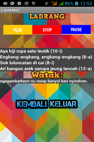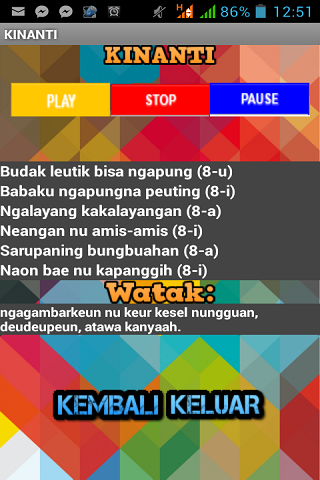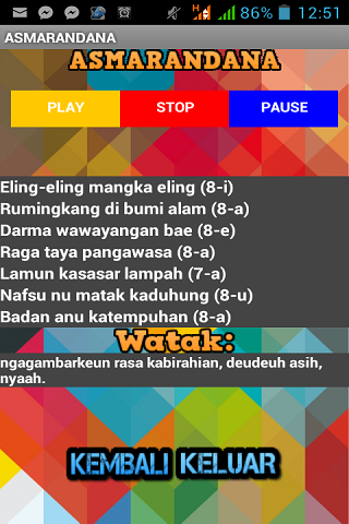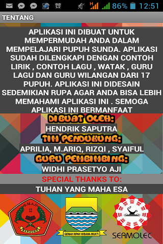 Aplikasi ini dibuat untuk memudahkan anda dalam mempelajari pupuh sunda. Didalam aplikasi ini sudah dilengkapi dengan