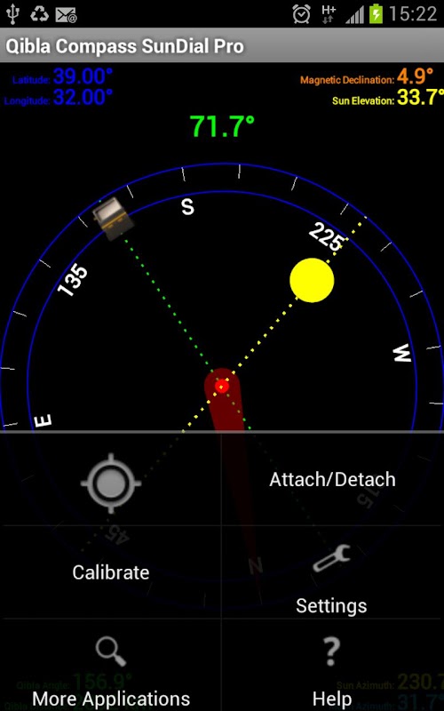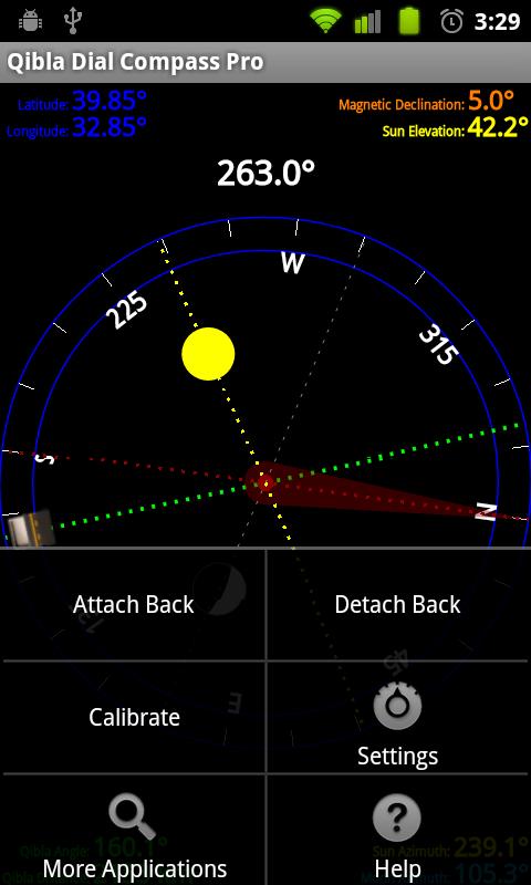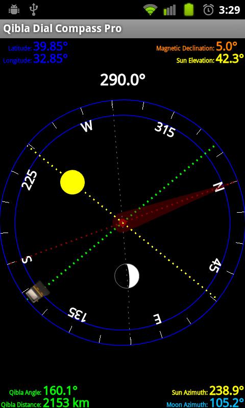 Qibla Direction Finder both using Sun dial, Moon dial and compass device inside the phone. Detects qibla direction using both compass device and positions of the sun and moon at the sky if available.