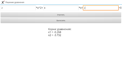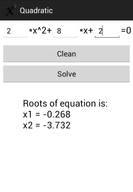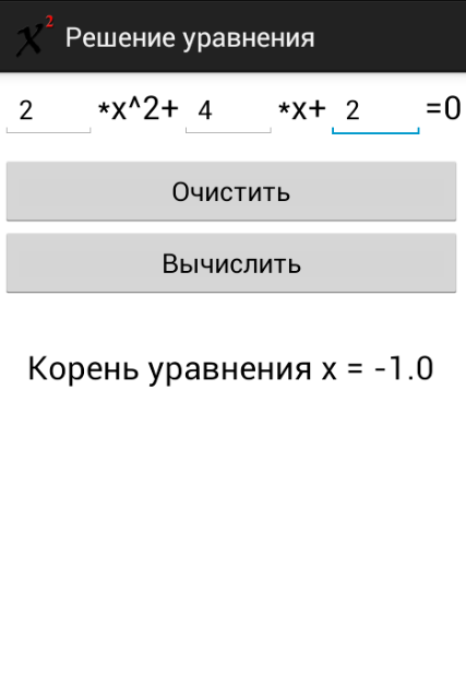 A simple application for solving quadratic equations. Processed all possible (D <0, D = 0, D> 0). Just enter the values of the coefficients of the quadratic equation, then the program will do the math.