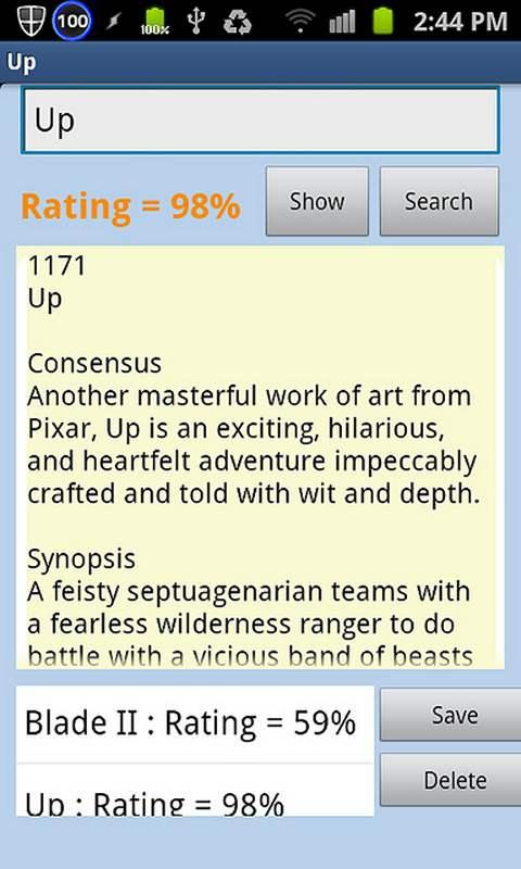 Quick Movie Review connects to RottenTomatoes.com and shows the rating, Summary and Synopsis of the movie you want. You can search for a movie using keywords, and save your selection to a database.