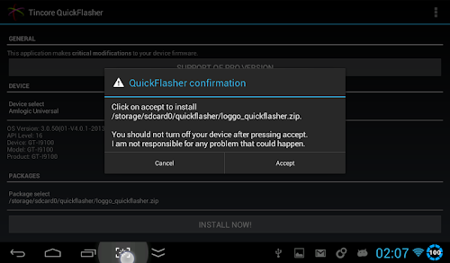 The application searches for zipped packages on a /quickflasher directory on any of your SD or USB mounted devices. This packages can contain partition images and/or scripts.