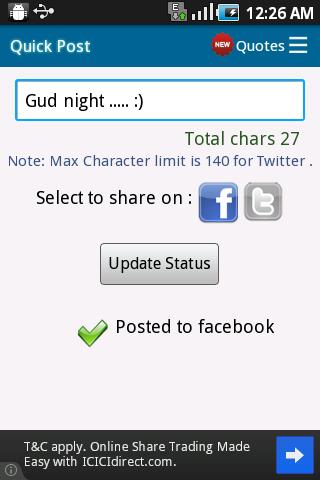 With QuickPost you can update status on facebook and twitter without moving between apps.