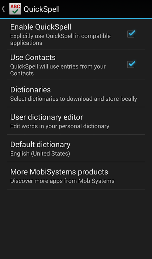 Warning: QuickSpell cannot work as default Android spell checker on heavily customized Android distributions, such as for example Samsung TouchWiz devices. Users with such devices might not be able to see Android Spell Check settings screen and thus not being able to benefit from QuickSpell in the built-in Android applications. However, QuickSpell will continue to work with MobiSystems OfficeSuite Pro.