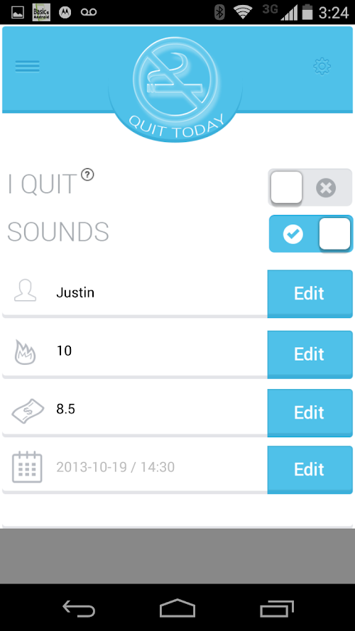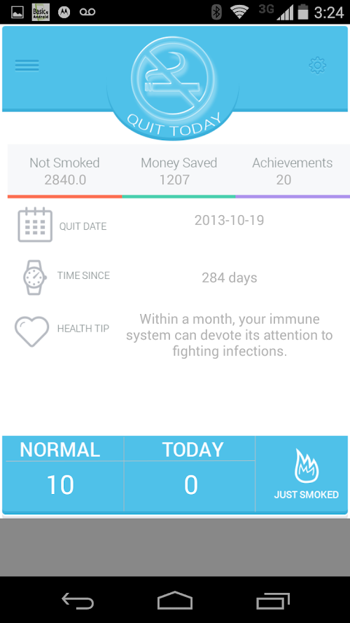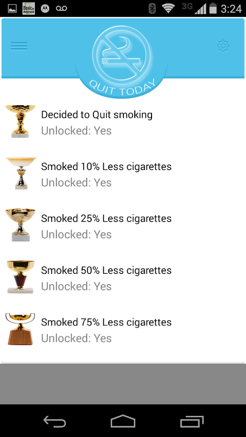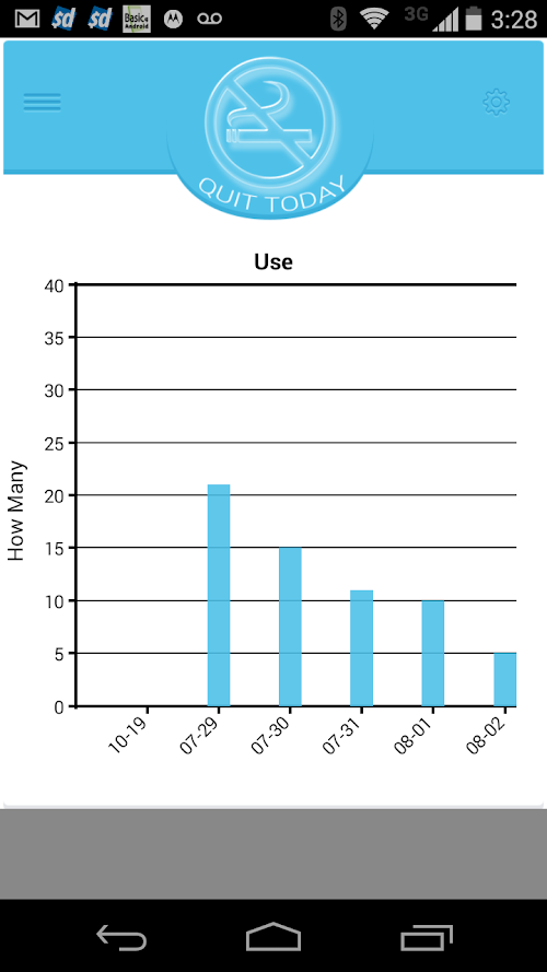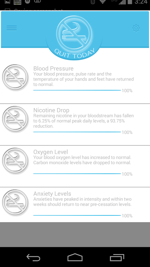 Quit Today begins tracking your progress immediately both in its daily visual chart so you can see how much you are smoking on a daily basis as well as with its progressive achievements with health benefits.