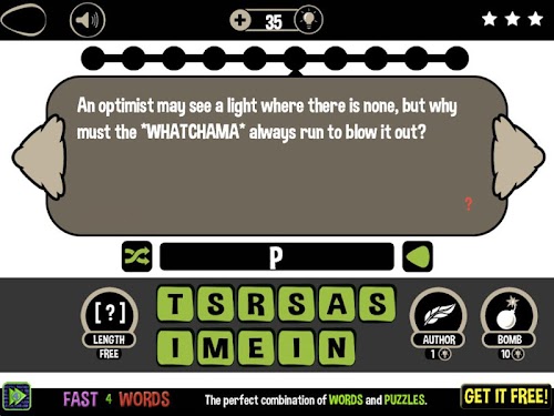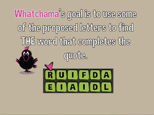 WHATCHAMA is tons of fun alone or for the whole family. Play alone in ...heu... your bedroom or with everyone in the car or the living-room and laugh together as you are trying to discover the *WHATCHAMA*, the secret word that completes the quote.