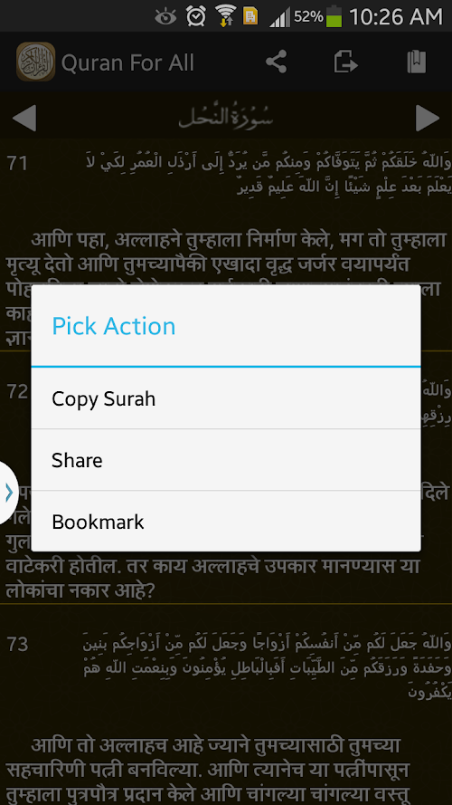 QuranForAll is a Free Android App provided with a unique feature of its Translation available in all possible Major Indian Languages.