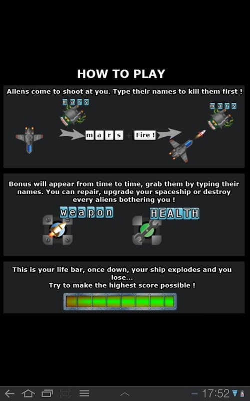 Keywords: Qwerty Warriors, Azerty Warriors, Typing Game, Qwerty Wars, Azerty Wars, Space, Space wars, Keyboard Game, Speed Game, Aliens, Galaxy, Star Wars, Qwertz, Android market, doodle jump, angry birds.