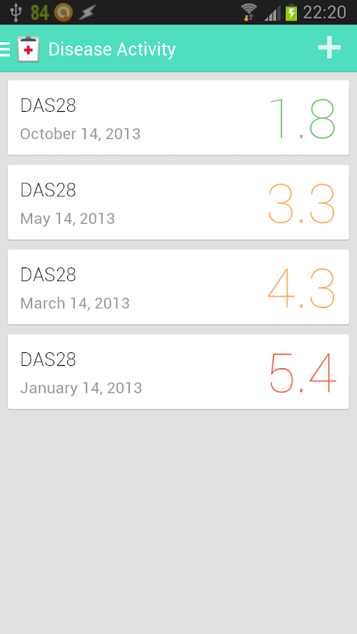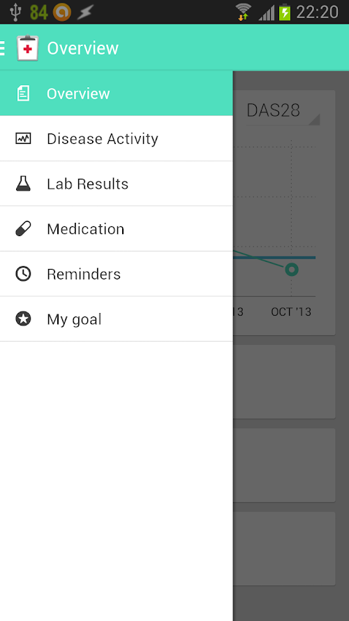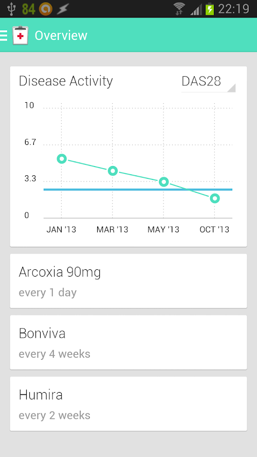 It helps you keeps track of your disease activity, medication, doctor appointments and laboratory results. Disease activity scores are visualized to help you and your doctor have a better overview of your health and plan future treatment.