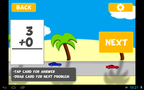 Flash card mode is like having a deck of addition flash cards on your phone or tablet. You can move through the deck by either hitting the next button or by flicking the flash card itself with a finger. To show the answer, just tap the flash card. The options allow you to choose between easy, medium, and hard problem levels that coincide with the progressive difficulty levels in the racing game.