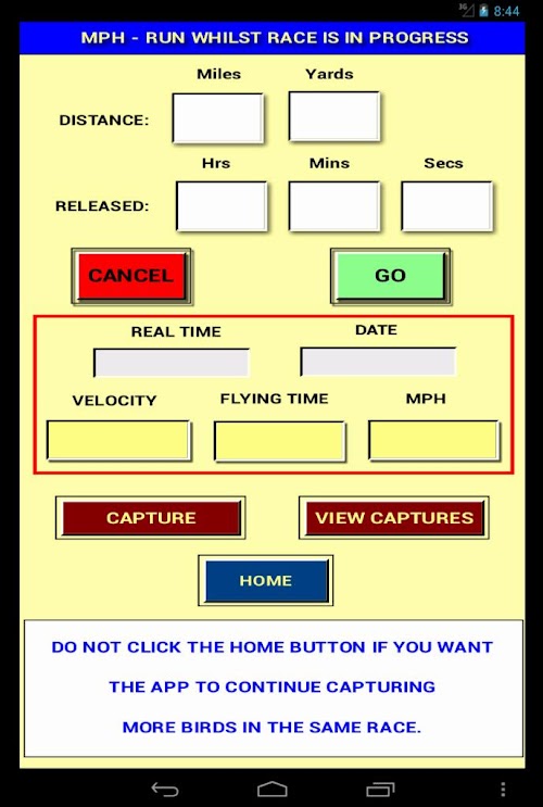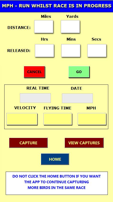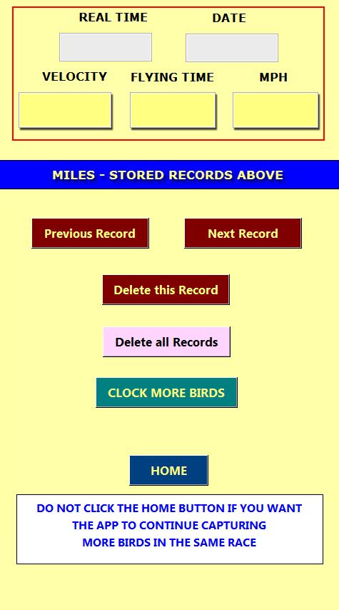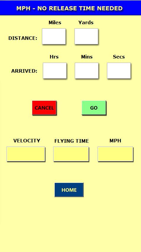 (Function 3)  On race day when the release time is known and before your first bird arrives, this function will with each passing second continuously update the flying time, velocity and speed, so no more referring to pen and paper guestimates.