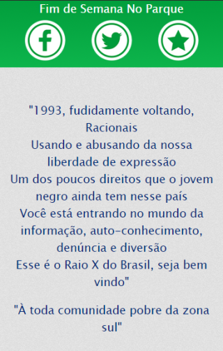 *Wikipedia Racionais Mc's is a Brazilian rap group, founded in 1989, and formed by mcs Mano Brown, Edi Rock and Ice Blue and dj KL Jay. It is considered by many as the hip hop group most relevant and influential of Brazil.