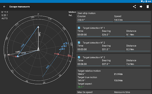 - Determine evasive maneuver by turn to starboard, left and speed reduction with single target.