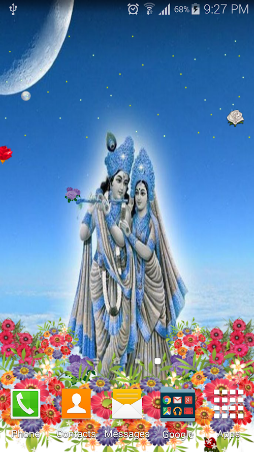 Radha and Krishna beautiful live wallpaper with flowers and twinkling stars.