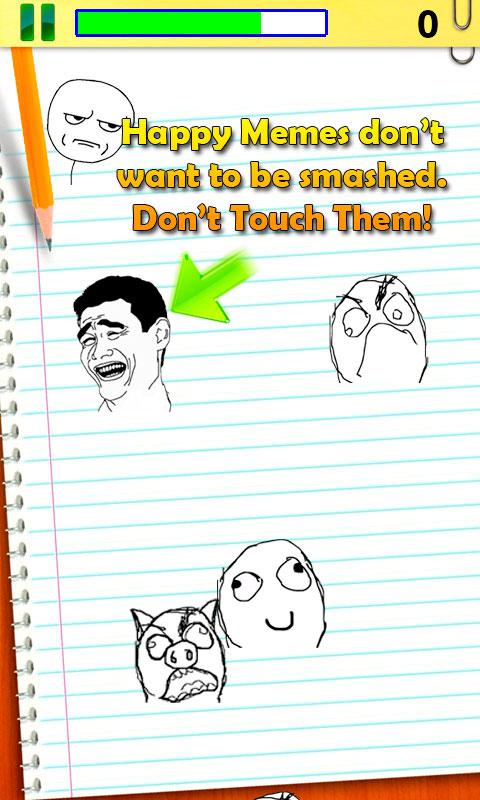 - Don't Touch Happy Faces: Happy Memes don’t want to be smashed. If you touch them you will lose life.
