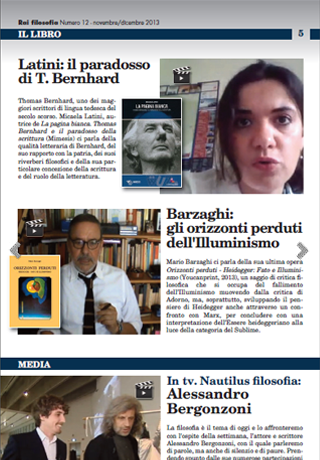 Contains portraits of philosophers, articles and book previews and reviews on the works. An observatory of experts, routes, special. In addition, the headings 'web stories' and 'sent by you', with the testimonies and video footage, sometimes unpublished, taken from the vast and valuable repertoire of the Teche Rai.