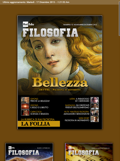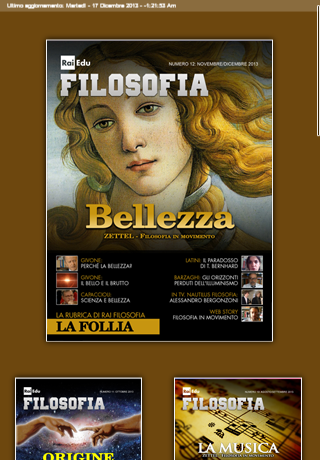 Contiene ritratti di filosofi, articoli e anteprime di libri e recensioni sulle opere. Un osservatorio di esperti, percorsi, speciali. Inoltre, le rubriche 'web stories' e 'inviati da voi', con le testimonianze video e filmati, talvolta inediti, tratti dal vasto e prezioso repertorio delle Teche Rai.And 'the free magazine Rai Philosophy (www.filosofia.rai.it) with the best content on the new video portal theme created by Rai Educational.