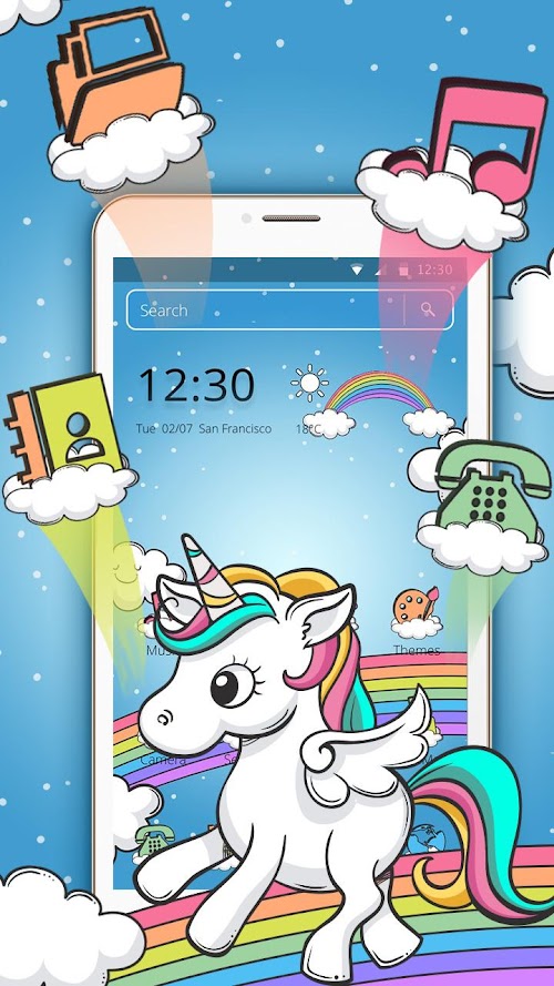 There are pink, red, yellow, lovely and romantic themes for cute girls; Blue, gray and black theme for business, tech and auto & vehicle fans; Colorful themes for cartoon and movie addicts; Abstract themes and live wallpapers for art fans; Cute pets & animals for animal lovers; Football and basketball celebrities for sports fans; Greenery themes for those who love nature; And the starry night theme for those who love stars. During holidays, you can find our beautiful festive themes when it's time to celebrate. There are also 3D themes, live wallpapers and other fashion elements to redefine your vision. Rainbow Unicorn Launcher theme is made for launcher to customize your mobile phone with Rainbow Unicorn Launcher theme live wallpaper and SSS lock menu. Anything you like can be put into your home screen!