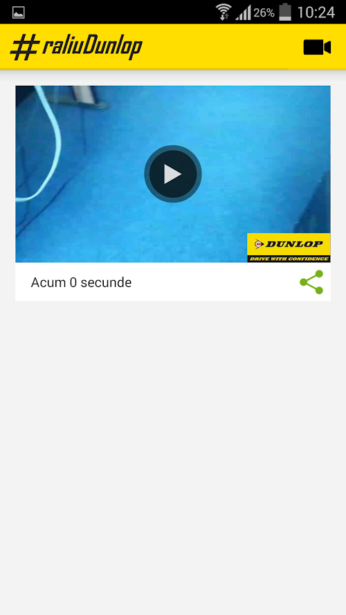Aplicatia permite vizitatorilor "Campionatului National de Raliu Dunlop Romania" sa posteze printr-un singur click un filmulet de până la 10 secunde. Dunlop este partenerul oficial al CNR (Campionatul National de Raliuri) și această aplicație este conceputa special de Dunlop pentru evenimente auto.The application allows visitors "National Rally Championship Dunlop Romania" to post a single click a movie up to 10 seconds. Dunlop is the official partner of the CNR (National Rally Championship) and this application is designed specifically for Dunlop car events.