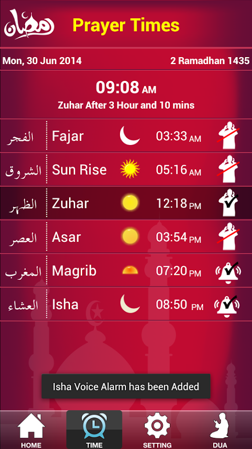 - You can set alarm of either azan or voice message in the Prayer Time page by clicking on any prayer.