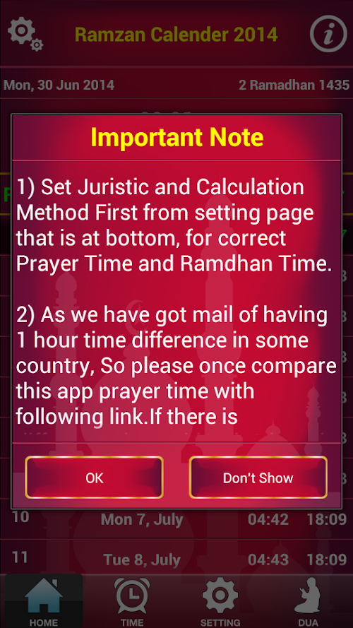 - After dialog setting page will be open just set Calculation Method and Juristic Method according your Continent Region.