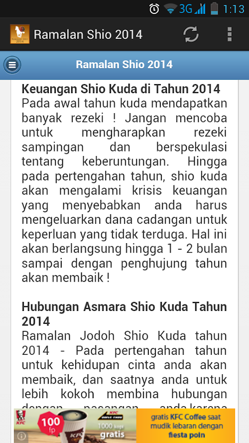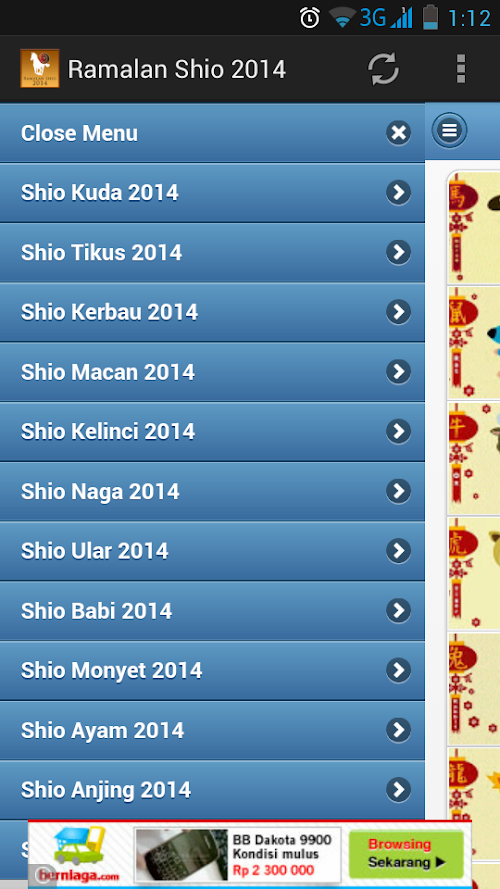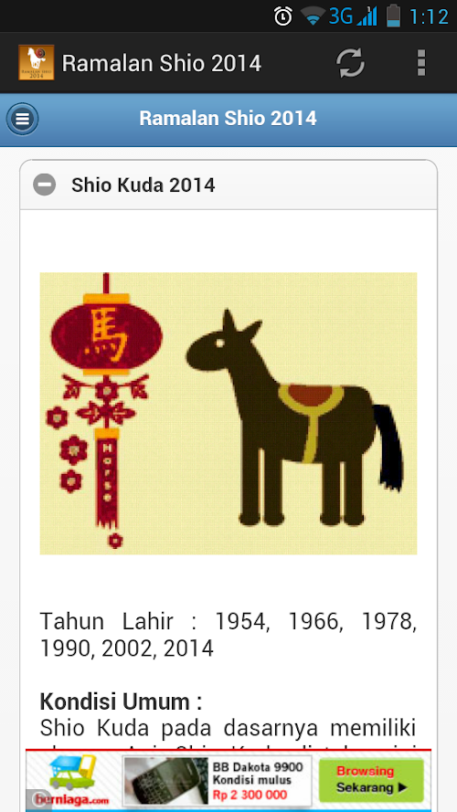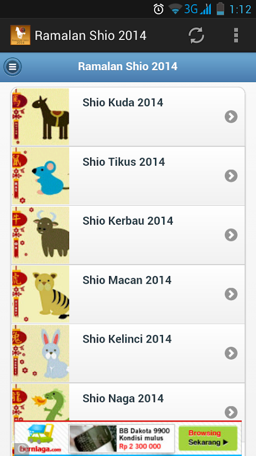 Aplikasi Ramalan Shio 2014 merupakan zodiak china yang dapat meramalkan peruntungan dan karakteristik anda tahun 2014 ini dalam 12 lambang binatang mulai dari tikus hingga babi. Setiap tahun kelahiran, shio seseorang berbeda-beda. Shio seseorang dihubungkan dengan elemen tahun yang tengah menaungi. Tahun 2014 ini, elemennya adalah kuda kayu. Ketahui seperti apa prediksi peruntungan berdasarkan shio-mu tahun ini dalam aplikasi ini.Application Shio forecast 2014 is the china zodiac and characteristics can predict your luck this 2014 emblem in 12 animals ranging from mice to pigs. Each year of birth, zodiac someone different. Shio someone associated with the elements in the middle of the shade. In 2014, the element is a wooden horse. Know what zodiac predictions based on your luck this year in this application.