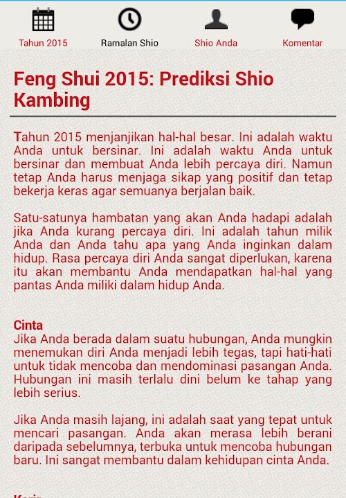 In this App, you will get a variety of prediction / forecast in 2015 from various sides, ranging from finance, health, love, career, family, and so forth.