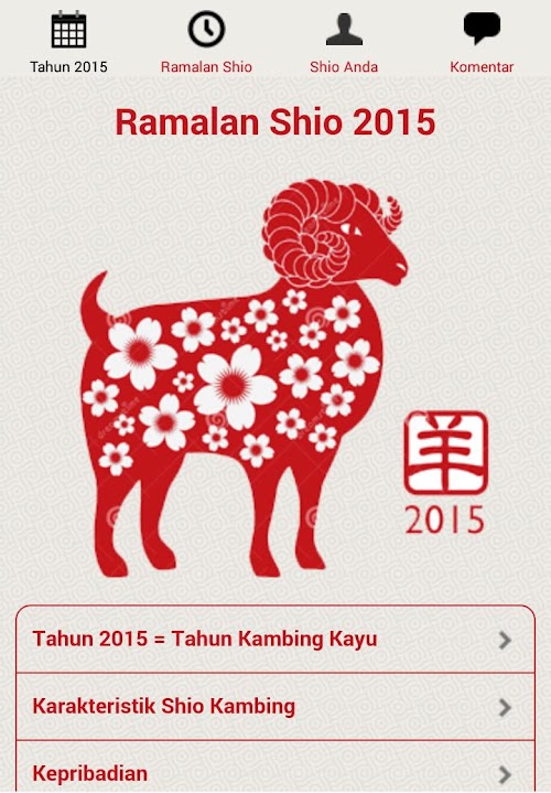 Sebentar lagi kita akan memasuki tahun 2015, yang dalam tahun lunar termasuk kategori tahun Kambing Kayu. Bagaimana ramalan tahun ini bagi kehidupan Anda? Akankah lebih baik dari tahun sebelumnya ataukah Anda harus lebih berhati-hati?