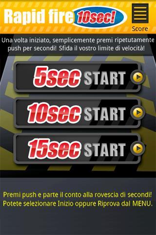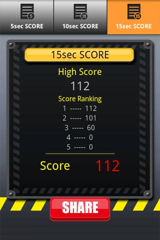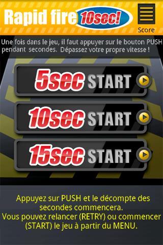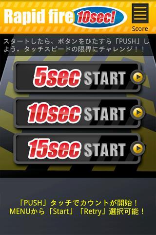 Rapid fire in 10 seconds! Once started, Just tap the "push" buttone for 10 seconds! Challenge your limit of speed! Tap "push" and the 10 seconds count down will start! You can select Start" or "Retry" from MENU.