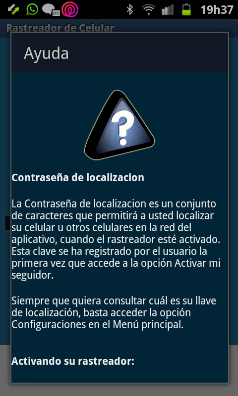 - Auxiliar en la localización de aparatos hurtados: Si el celular hurtado estuviera con el rastreador habilitado y emitiendo la localización correctamente, usted podrá rastrearlo a través de otro aparato (que también posea la aplicación instalada) a través de la función "Localizar un