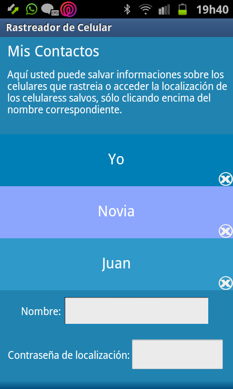 - Saber donde sus familiares o personas queridas están: Es fácil! Usted instala el app Rastreador de Celular Avanzado en su teléfono. Sus hijos, novia, amigos, familiares instalan en los teléfonos de ellos. Listo! vosotros podréis en pocos clics ver la localización uno del otro siempre que deseen.