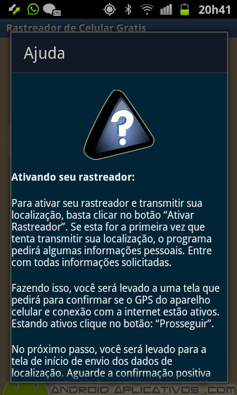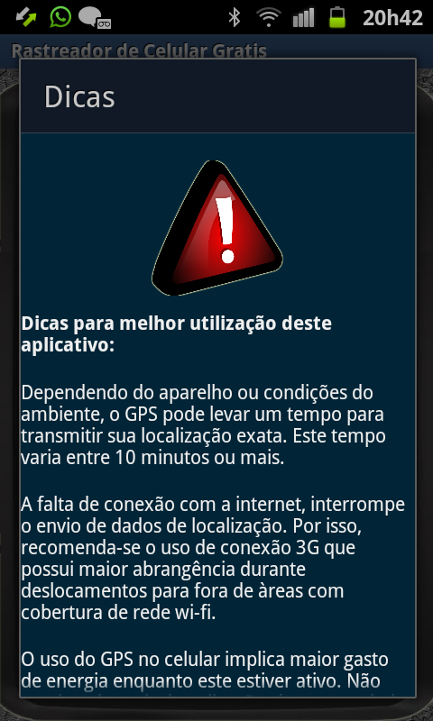 O Rastreador de Celular Gratis é um software que pressupõe a permissão do usuário que tem instalado e ativo no seu dispositivo. O Rastreador de Celular Gratis só poderá ser instalado e utilizado em dispositivos que pertençam ao usuário ou que a pessoa portadora do dispositivo tenha conhecimento e concorde que está sendo monitorada.