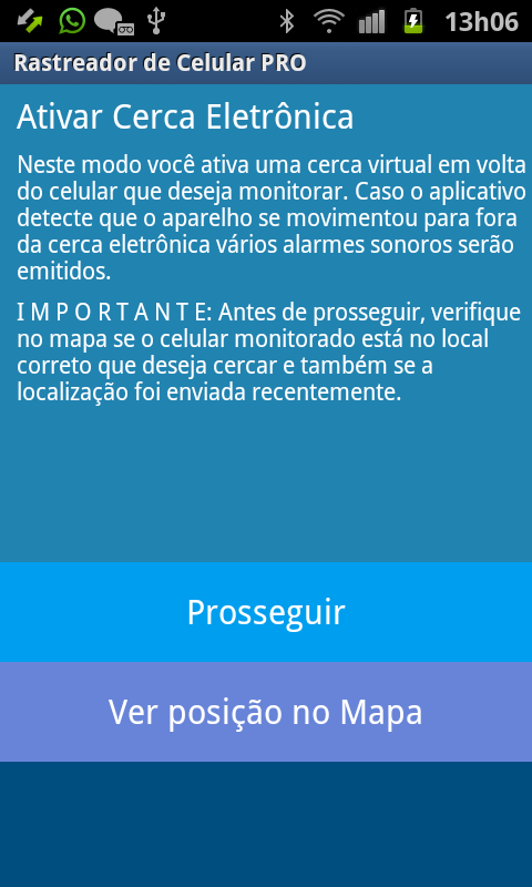 - Cerca Eletrônica: No modo Cerca Eletrônica o aplicativo faz uma conexão virtual com o celular e começa a monitorá-lo buscando detectar alterações de posição. Caso o programa perceba que o celular se movimentou para fora da cerca eletrônica, um alerta sonoro é emitido ao usuário.