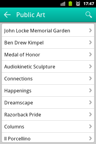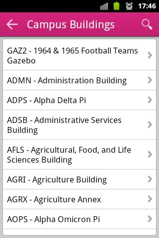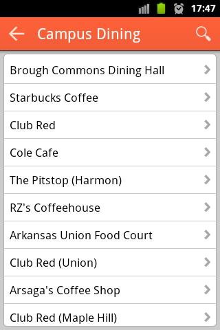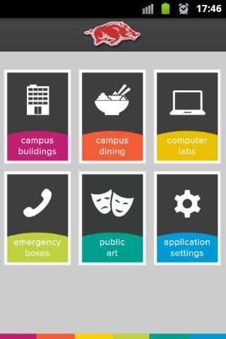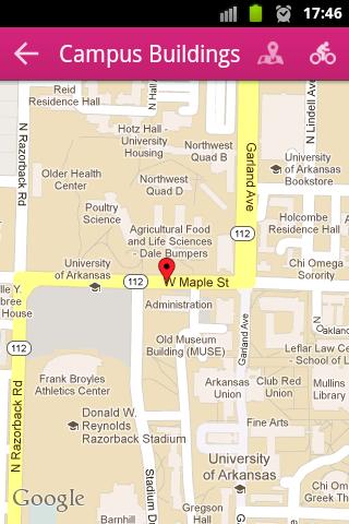 Razorbacks Campus Guide shows you how to navigate through the University of Arkansas, Fayetteville campus without having to ask for directions. Search for campus buildings, dining areas, public art, computer labs and emergency boxes closest to you and get walking directions to your destination.