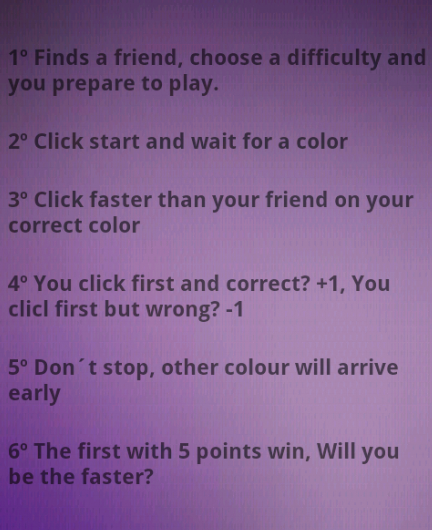 Two-player game, compete with your friends to look who has the fastest reflexes in different categories of difficulty. Click faster than your rival on the correct color.