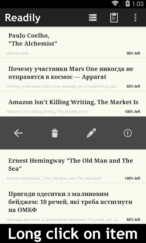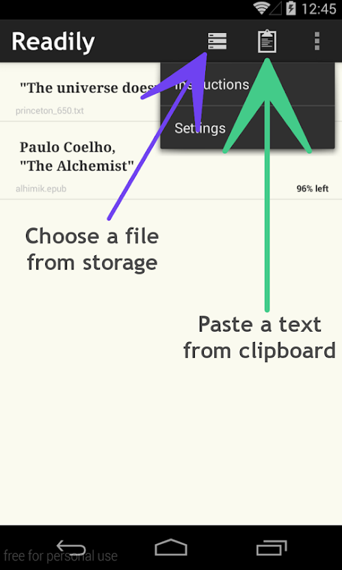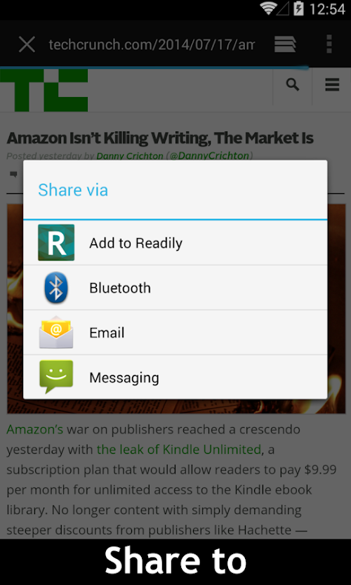 * Shared text: simply share to Readily from Flipboard, Instapaper, Pocket, Google Keep, Evernote, etc.